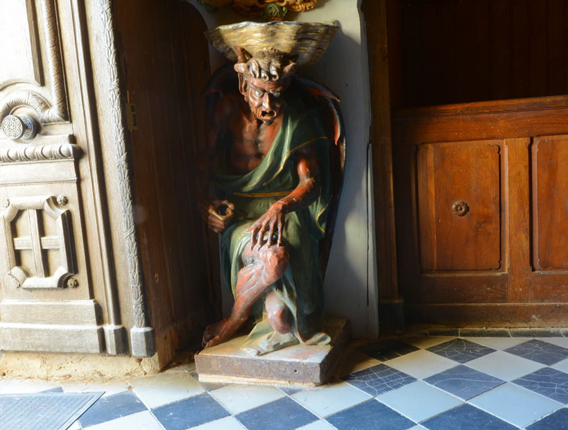 Photo du site TerresCathares : Bénitier à l’entrée de l’église … Le diable qui porte la vasque